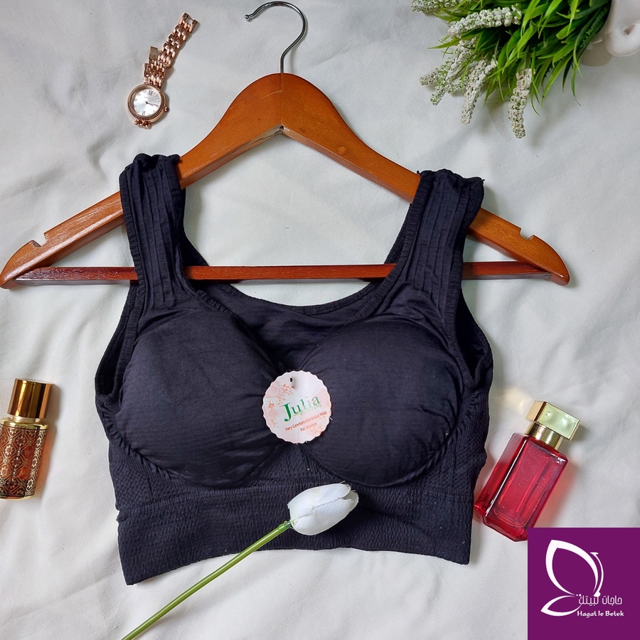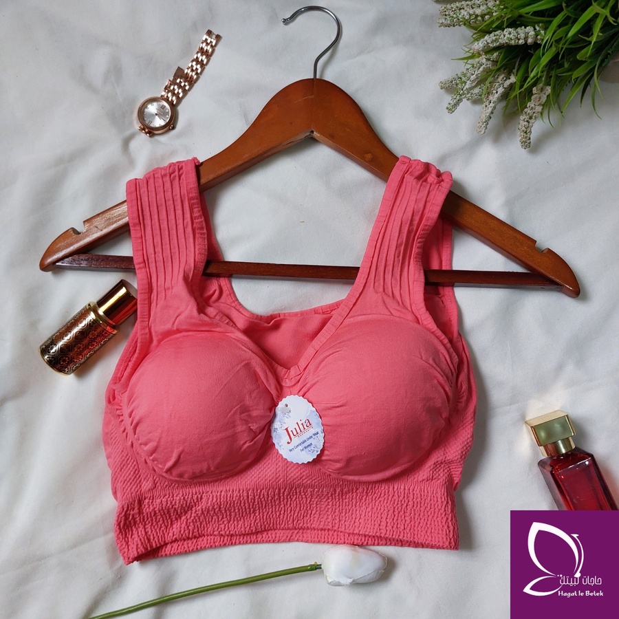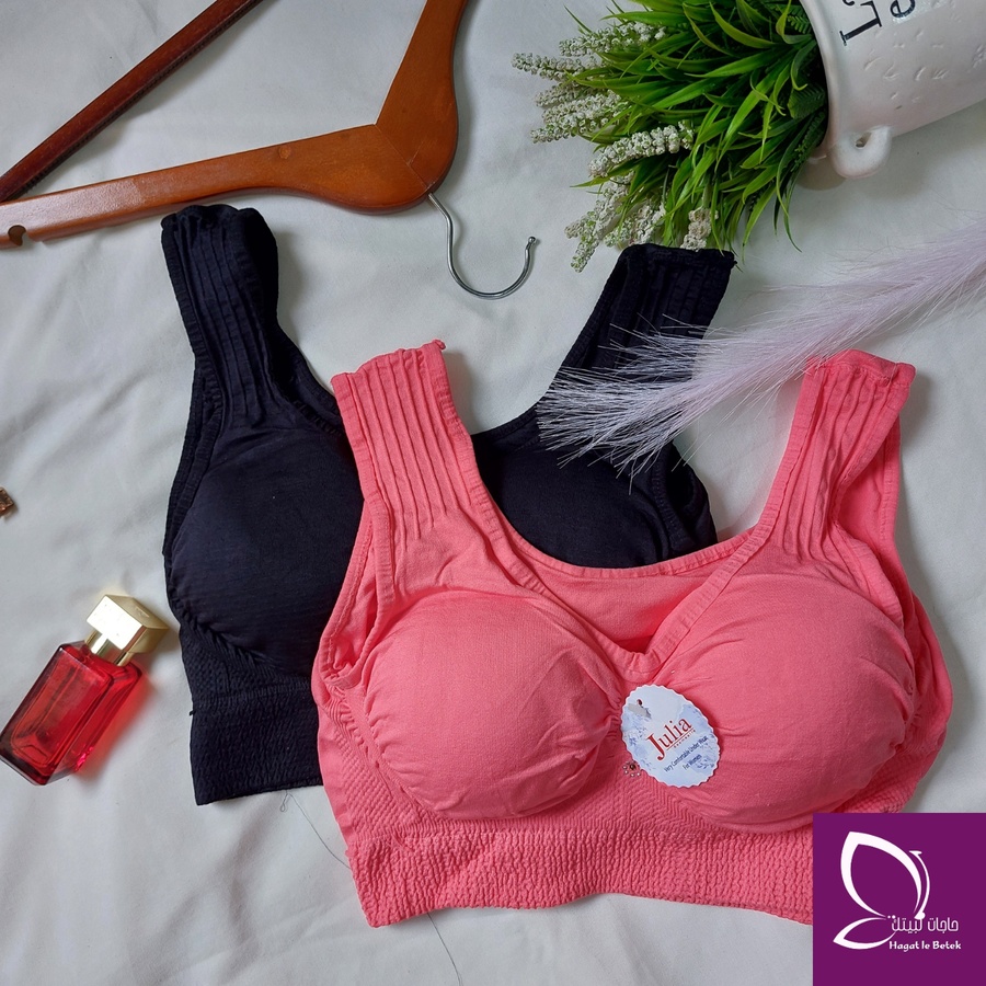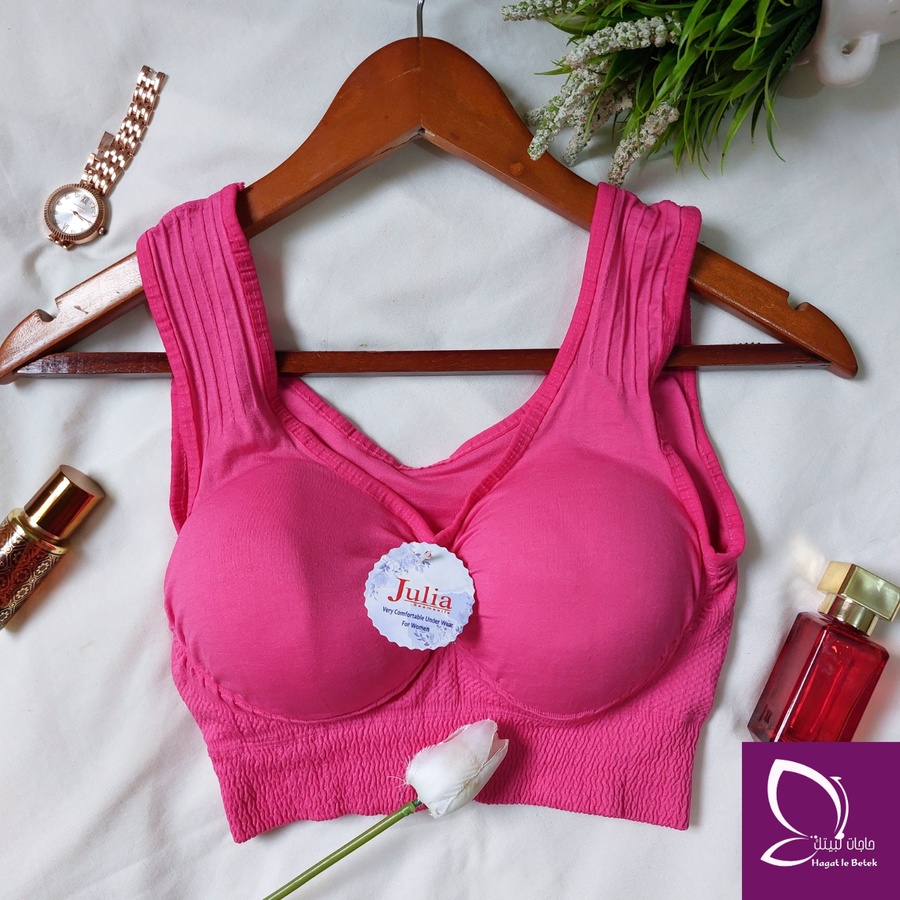 “بوش برا كلاسيك من براند جوليا بخامة كارينا. تصميم بحمالة عريضة مش بيبان تحت اللبس، مناسب من وزن 30 لـ70 كيلو بمقاسين مختلفين لراحة وثبات طول اليوم.”